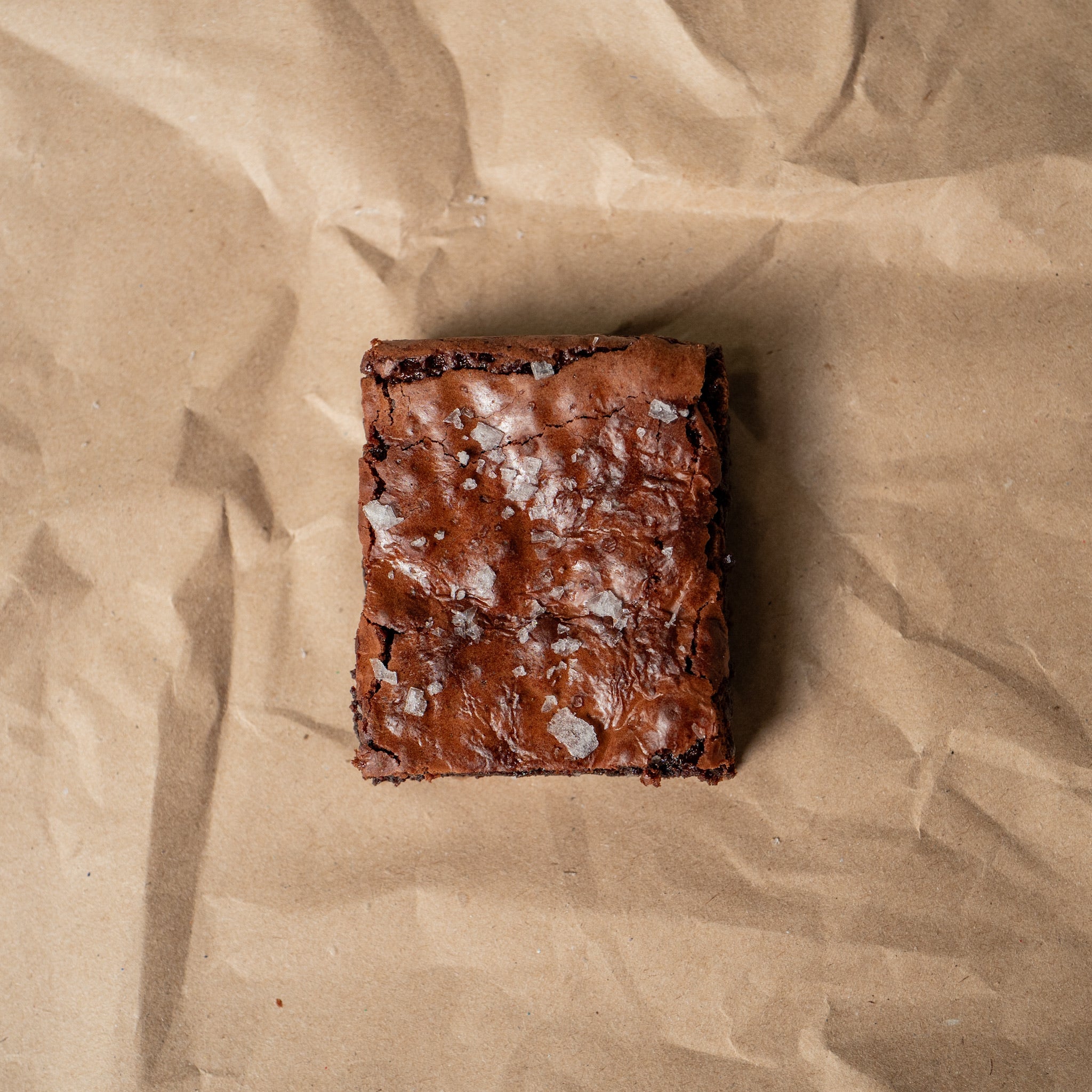 A rich, decadent, fudgy brownie made with premium Valrhona and Callebaut chocolate, studded with caramel chips and finished with Maldon sea salt flakes. Deep chocolate flavor with a soft, chewy center and a beautiful flaky, crackly top we all love. Perfect with coffee or just on its own.